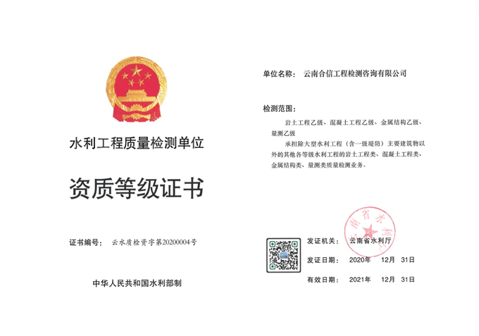 “水利工程質(zhì)量檢測單位乙級資質(zhì)”的取得,是云南省水利廳對云南合信公司檢測能力的充分肯定,標(biāo)志著公司的服務(wù)能力進(jìn)一步增強(qiáng),綜合競爭力進(jìn)一步提高,為公司跨領(lǐng)域、跨區(qū)域發(fā)展打下了良好的基礎(chǔ)。